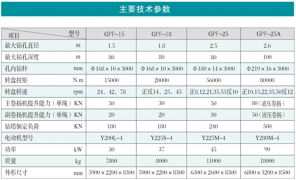 GPF型系列工程鉆機(jī)是一種可滿足正、反循環(huán)鉆進(jìn)工藝要求的大口徑轉(zhuǎn)盤式鉆孔設(shè)備。主要用于橋粱、港口、高層建筑、水壩等基礎(chǔ)工程大口徑灌注樁施,還可鉆鑿水井及其它工程孔。